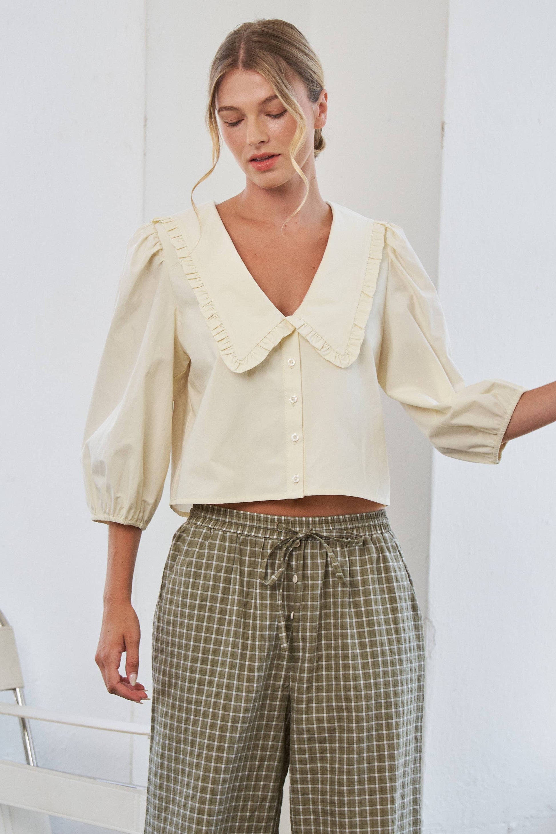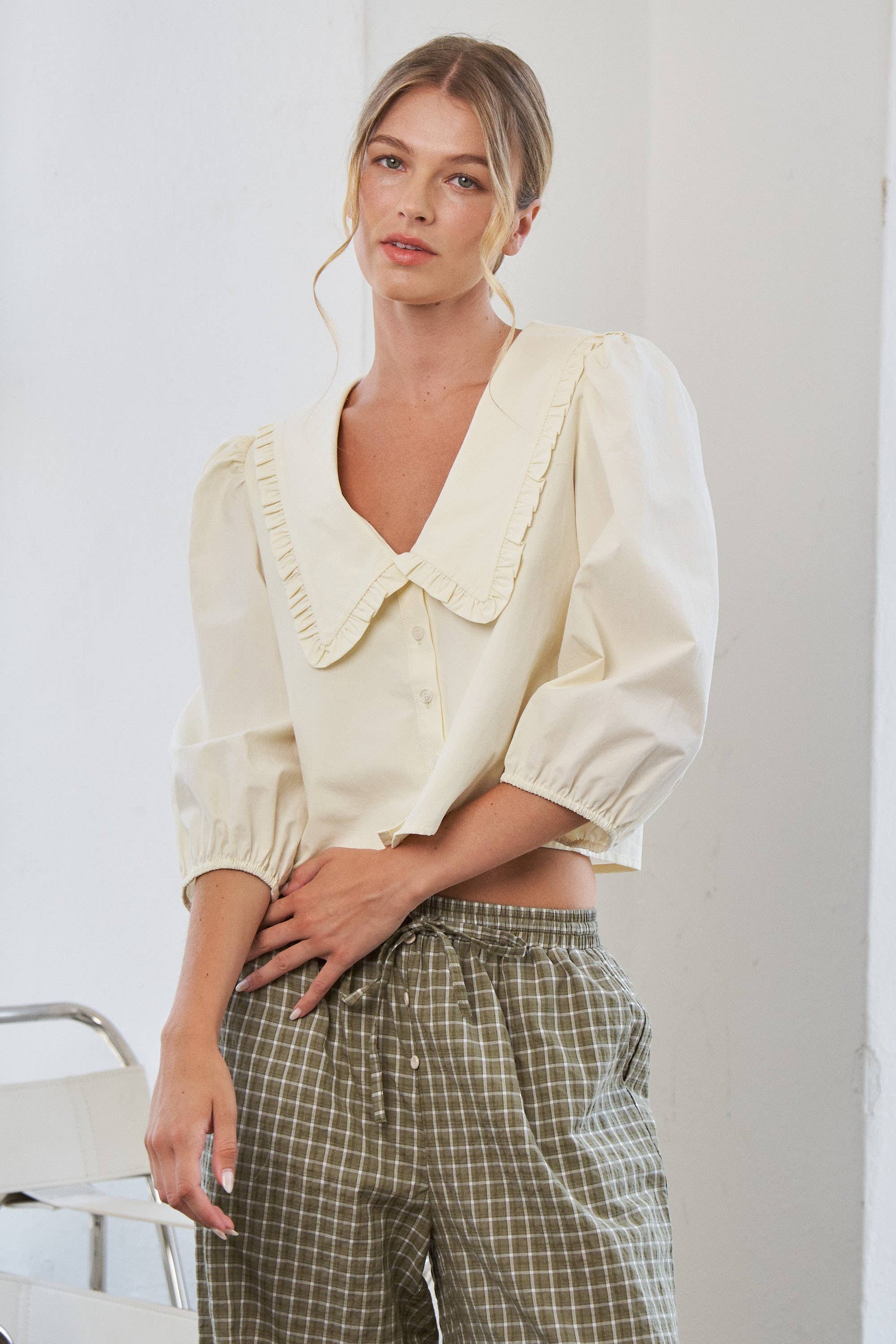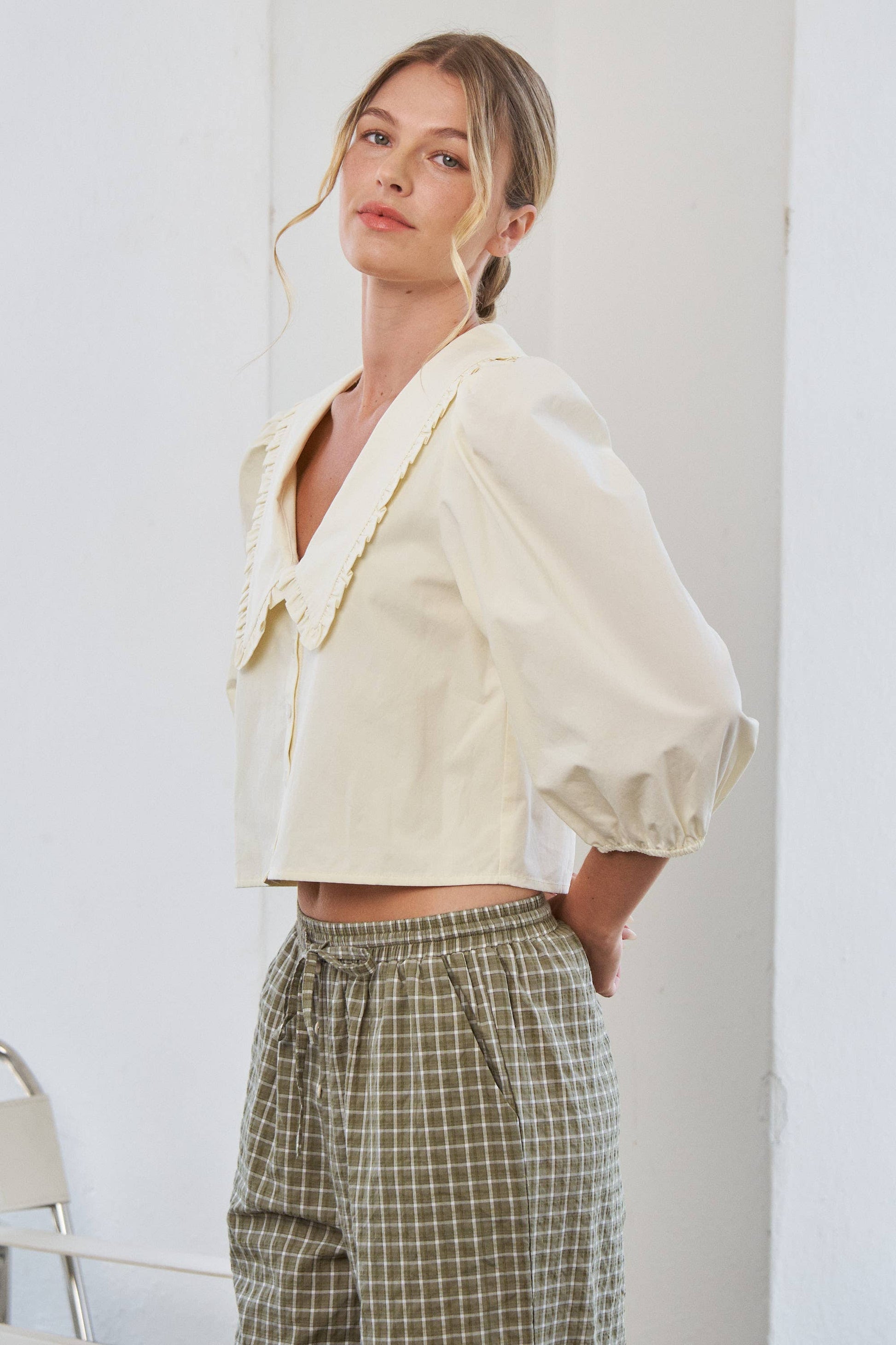 Playful and sweet with just enough edge. A cropped cream blouse with a ruffled Peter Pan collar — easy to pair, effortless to love.