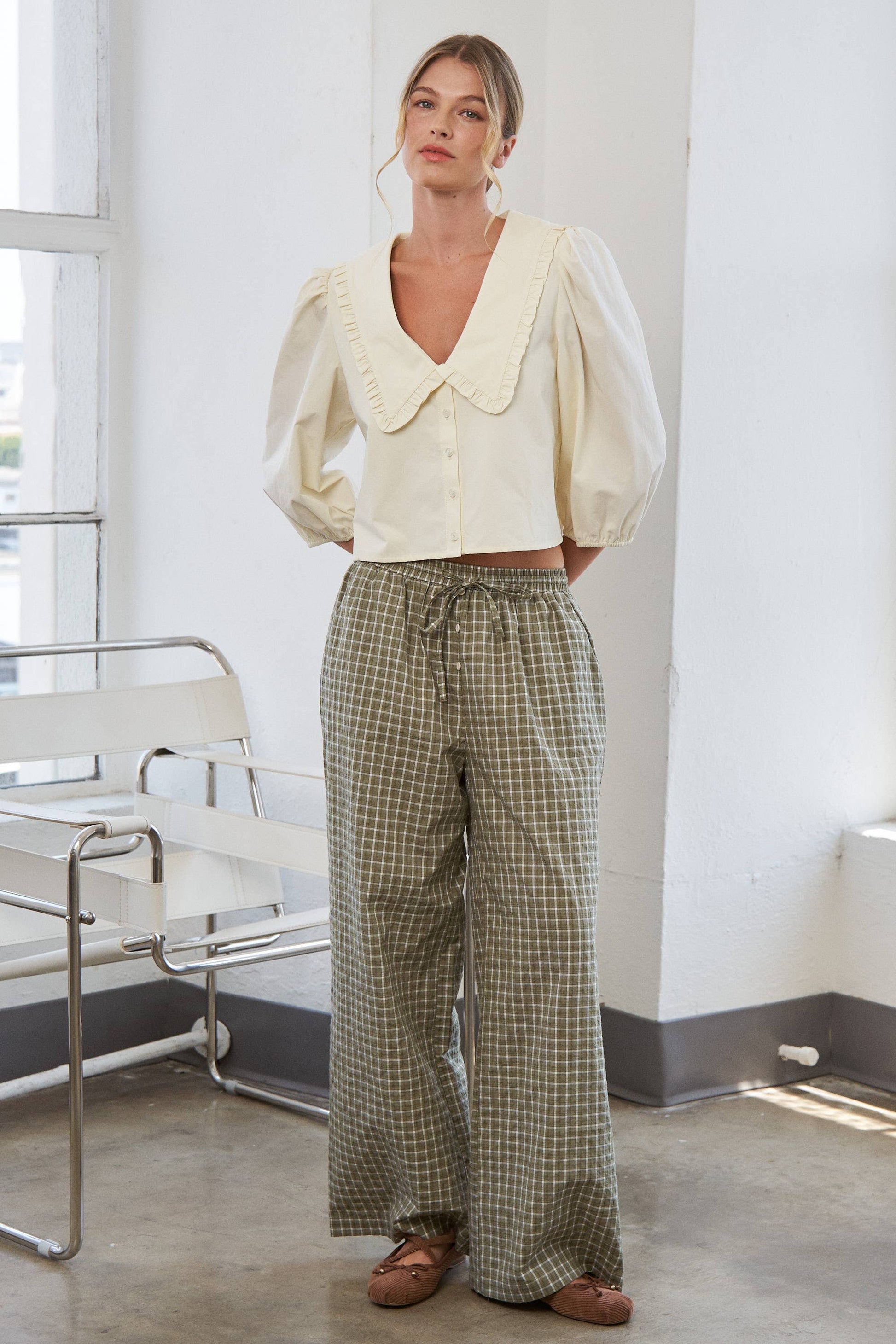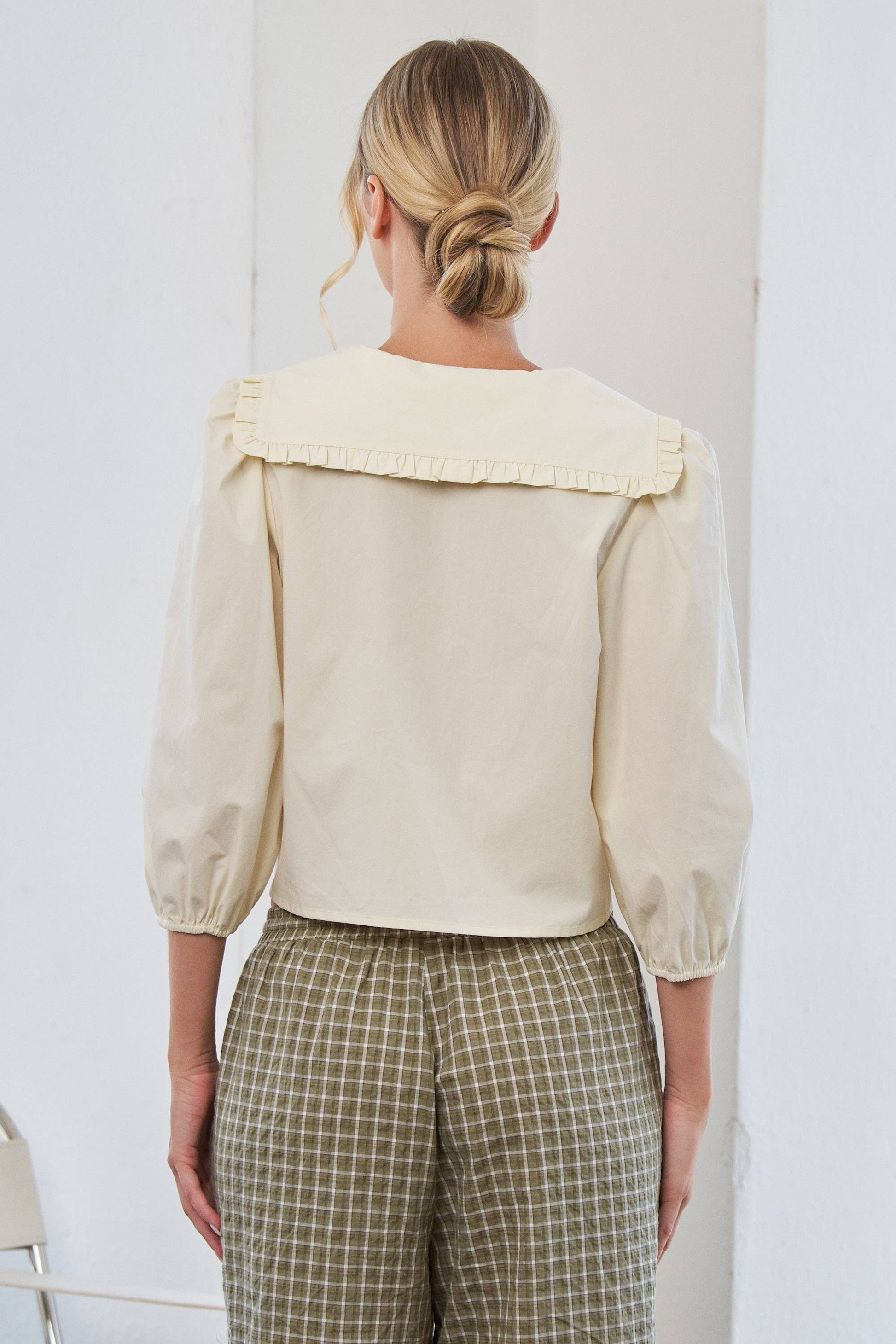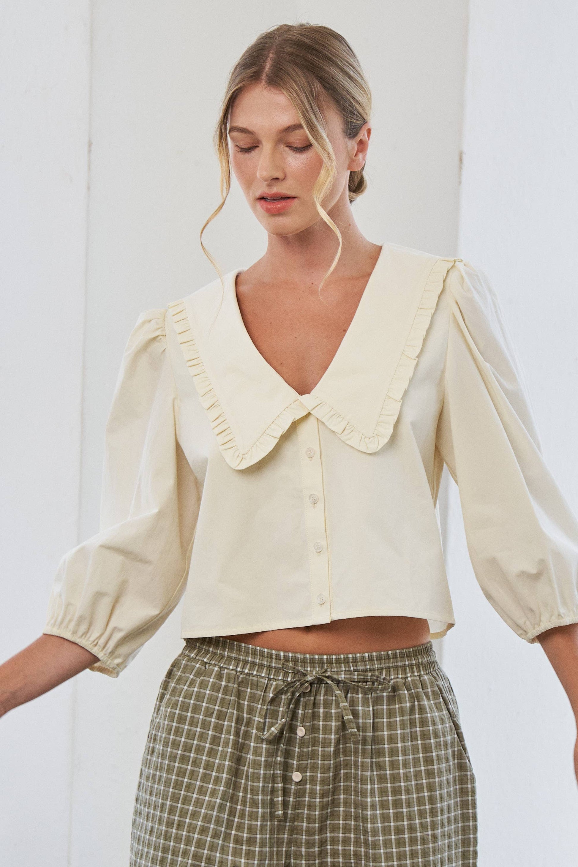 Playful and sweet with just enough edge. A cropped cream blouse with a ruffled Peter Pan collar — easy to pair, effortless to love.