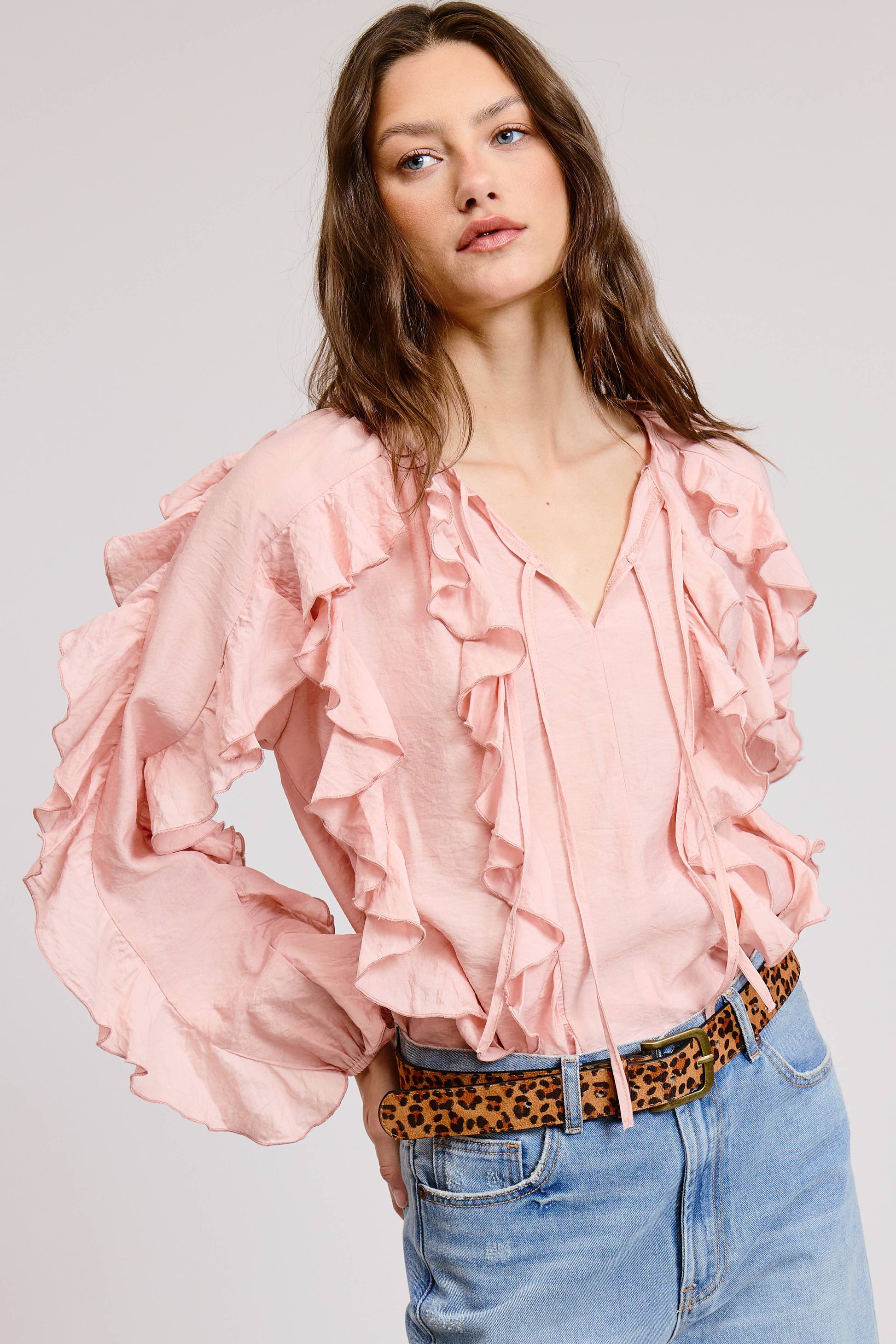 Sweet, airy, and indulgent. Ruffled details in dreamy cream make this blouse romantic but wearable every day.