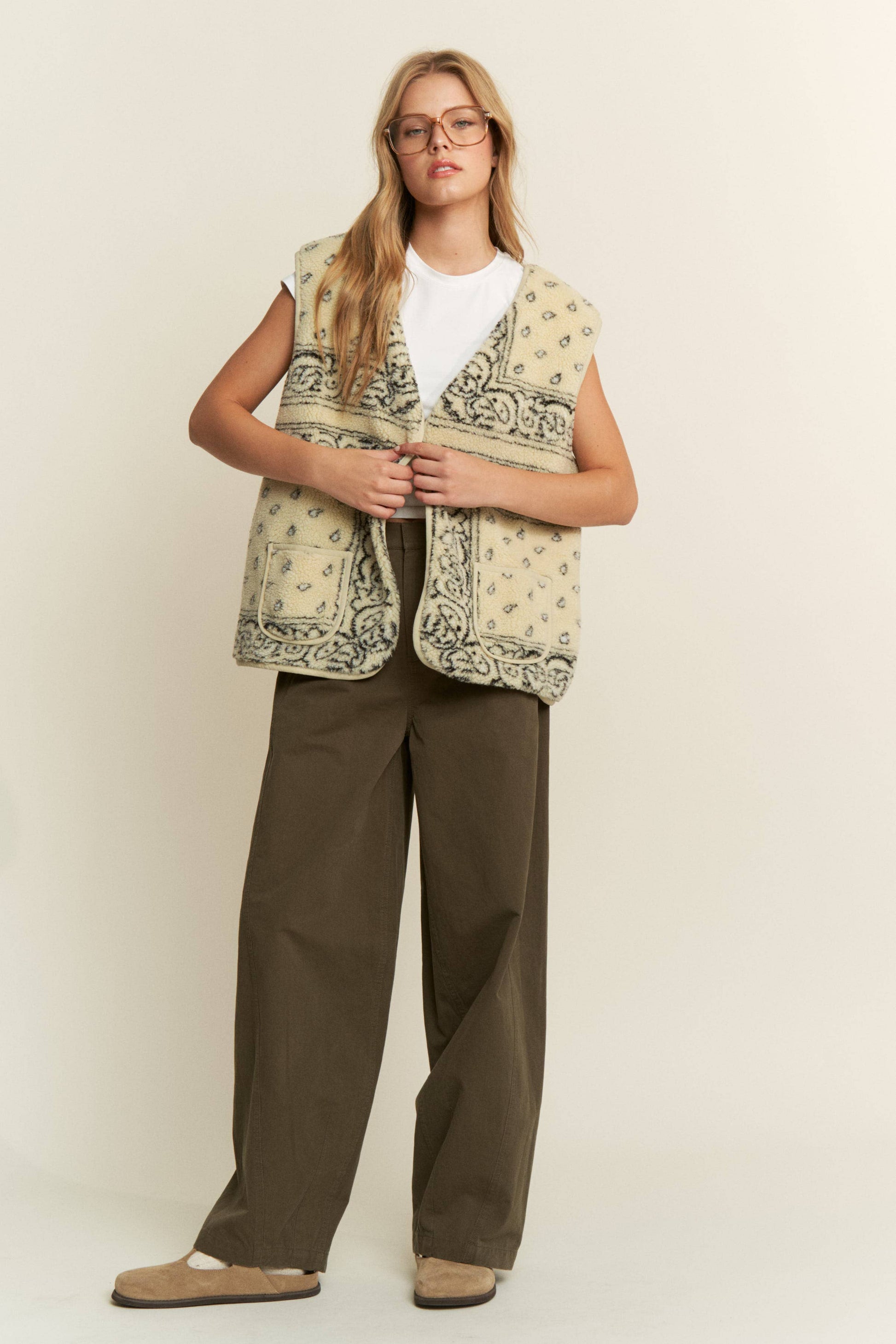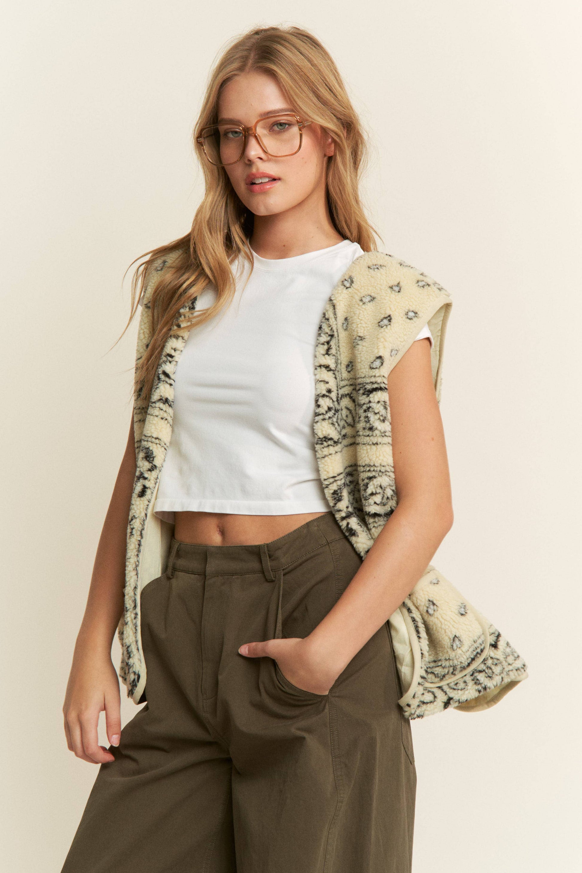 Patterned sherpa with a western twist. Cream base, intricate print, and soft structure — made for layering over denim or knits.